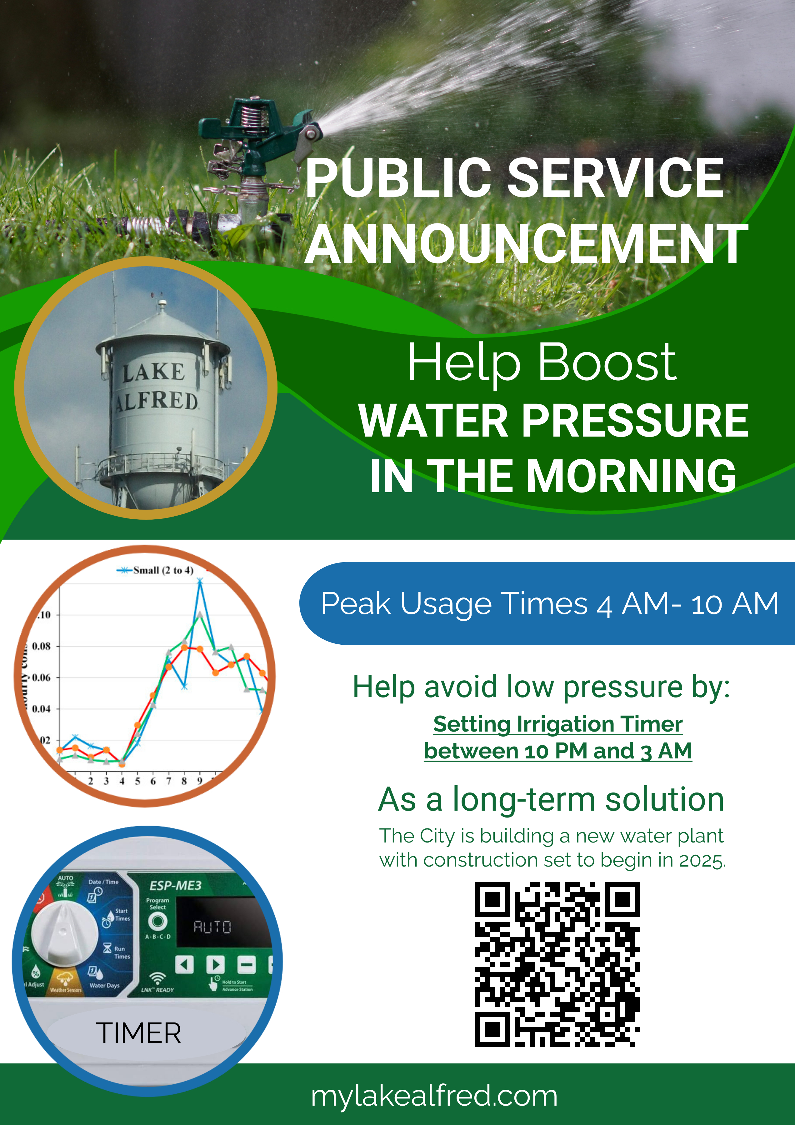 The City of Lake Alfred is encouraging everyone using irrigation systems to please set water timers to water between the hours of 10 PM and 3 AM. This will help boost the water capacity in the morning hours. Construction on the City of Lake Alfred's second water plant began in 2025, and upon completion, it will provide additional water capacity for the City.